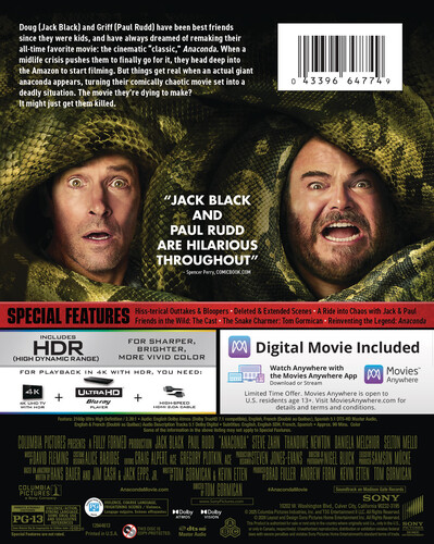 Longtime buds Griff (Paul Rudd), Doug (Jack Black), Kenny (Steve Zahn) and Claire (Thandiwe Newton) thought they could shake their mid-life blues by heading down to the Amazon and crafting an amateur remake of their beloved giant snake film from '97. Things are going to get a little too verite, however, as they find themselves on the run from an actual enormous-and ravenous-anaconda. Tribute action comedy co-stars Daniela Melchior, Selton Mello, Ione Skye and some surprising cameos. 99 min. Widescreen; Soundtrack: English.