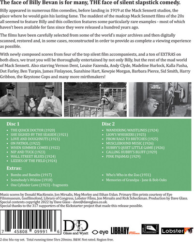 The face of Billy Bevan is for many, THE face of silent slapstick comedy and this 2 disc Blu-Ray set features some particularly rare examples of his work - many of which haven't been available for fans since they were released around a hundred years ago. The films have been carefully selected from some of the world's major archives and then digitally scanned, restored and, in some cases, reconstructed in order to provide as complete a viewing experience as possible. With newly composed scores and a ton of EXTRAS on both discs, we trust you will be thoroughly entertained by Billy, and the rest of the mad world of Mack Sennett. Also starring Ben Turpin, Vernon Dent, Louise Fazenda, Andy Clyde, Dot Farley, James Finlayson, the Keystone Cops and many more mirthmakers! - DISC 1: THE QUACK DOCTOR (1920); SHE SIGHED BY THE SEASIDE (1921); LOVE AND DOUGHNUTS (1921); ON PATROL (1922); WHEN SUMMER COMES (1922); NIP AND TUCK (1923); WALL STREET BLUES (1924); LIZZIES OF THE FIELD (1924) DISC 2: WANDERING WAISTLINES (1924); THE LION'S WHISKERS (1924); FROM RAGS TO BRITCHES (1925); MUSCLEBOUND MUSIC (1926); HUBBY'S QUIET LITTLE GAME (1926); CALLING HUBBY'S BLUFF (1929); PINK PAJAMAS (1929). Plus bonus shorts making a total of more than 5 hours' worth of hilarious rarities. Blu-ray is NTSC, Region-free.