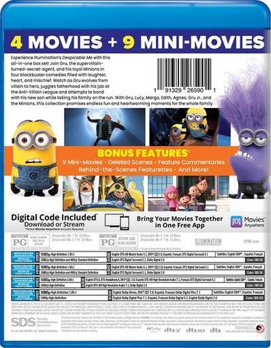 Experience Illumination's Despicable Me with this all-in-one box set! Join Gru, the supervillain-turned-secret-agent, and his loyal Minions in four blockbuster comedies filled with laughter, heart, and mischief. Watch as Gru evolves from villain to hero, juggles fatherhood with his job at the Anti-Villain League and attempts to bond with his new son while taking his family on the run. With Gru, Lucy, Margo, Edith, Agnes, Gru Jr., and the Minions, this collection promises endless fun and heartwarming moments for the whole family.