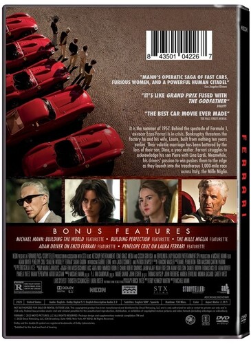 FERRARI is legendary director Michael Mann’s (HEAT, Miami Vice, Last of the Mohicans, Collateral) epic racing drama featuring Adam Driver. It is the summer of 1957 and ex-racer Enzo Ferrari (Driver) is in crisis, facing bankruptcy and a volatile marriage. Meanwhile, his drivers’ passion to win pushes them to the edge, as they launch into Italy's most treacherous race, the Mille Miglia. Also features Penélope Cruz , Shailene Woodley, and Patrick Dempsey.