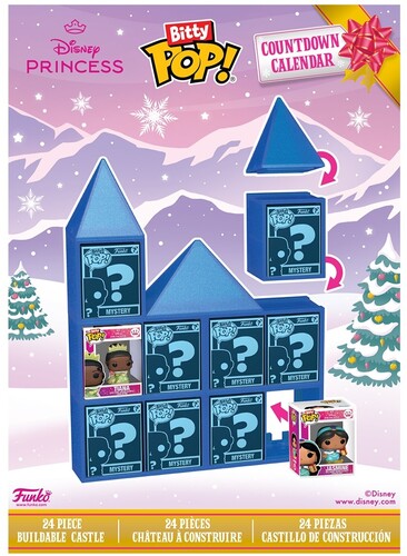 Count down to your favorite festive holiday—or any special occasion—with the Disney Princess 24-Day Bitty POP! Countdown Calendar! Open the tiny doors to reveal 10 Bitty POP! collectibles, 9 stackable display pieces, 3 holiday accessories, 1 keychain case, and 1 pin case. Expand your princess lineup by making this Disney Princess 24-Day Bitty POP! Countdown Calendar the next addition to your collection. Bitty POP! collectibles are packaged in hard acrylic cases with detachable bottom lids. Detachable bottom lids double as acrylic bases, to which the Bitty POP! figures are adhered. Vinyl figures are approximately 0.9 in (2.3 cm) tall. Acrylic keychain cases and acrylic pin cases are approximately 1.3 in W x 1.6 in H x 1.2 in D (3.3 cm W x 4.1 cm H x 3 cm D) and fit all standard Bitty POP! cases. Bitty POP! Keychain is approximately 3 in (7.6 cm) long.
