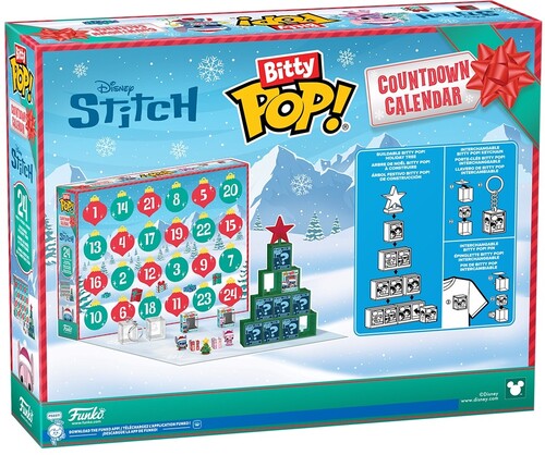Count down to your favorite festive holiday—or any special occasion—with the Disney’s Stitch 24-Day Bitty POP! Countdown Calendar! Open the tiny doors to reveal 10 Bitty POP! collectibles, 7 stackable display pieces, 3 holiday accessories, 2 keychain case, and 2 pin case. Expand your cute and fluffy lineup by making this Disney’s Stitch 24-Day Bitty POP! Countdown Calendar the next addition to your collection. Bitty POP! collectibles are packaged in hard acrylic cases with detachable bottom lids. Detachable bottom lids double as acrylic bases, to which the Bitty POP! figures are adhered. Vinyl figures are approximately 0.9 in (2.3 cm) tall. Acrylic keychain cases and acrylic pin cases are approximately 1.3 in W x 1.6 in H x 1.2 in D (3.3 cm W x 4.1 cm H x 3 cm D) and fit all standard Bitty POP! cases. Bitty POP! Keychain is approximately 3 in (7.6 cm) long.