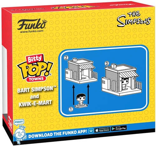 Your favorite The Simpsons™ POP! collectibles have been shrunk into Bitty POP! collectibles Expand your collection with Bitty POP! Town Bart Simpson™ and Kwik-E-Mart! Bitty POP! figure is packaged in a hard acrylic display case with a detachable bottom lid. The detachable bottom lid doubles as an acrylic base, to which the Bitty POP! figure is adhered. Remove this exclusive Bitty POP! Bart Simpson™ from his display case so he can step inside the Bitty POP! Town Kwik-E-Mart! Vinyl figures are approximately 0.9 and 1.75-inches tall. Warning: Choking Hazard. Collectibles are small. Not for children under the age of 3 years old.