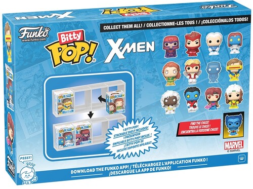 The world of POP! is getting bigger—and smaller—with Bitty POP! collectibles! Expand your Marvel X-Men collection with this 4-pack featuring Bitty POP! Rogue, Bitty POP! Nightcrawler, Bitty POP! Gambit, and Bitty POP! Storm. Find the possible Hyper Rare (1/6) chase of Bitty POP! Beast! Bitty POP! collectibles are packaged in hard acrylic cases with detachable bottom lids. The detachable bottom lids double as acrylic bases, to which the Bitty POP! collectibles are adhered. Sort and arrange your Bitty POP! collectibles with the included display case! Acrylic display cases are stackable and hold four Bitty POP! collectibles each. Vinyl collectibles are approximately 0.9 in (2.3 cm) tall. Four collectibles per single package purchase.