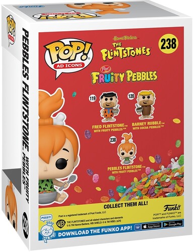 Pop! Pebbles Flintstone™ is ready to start the day off right with a delicious breakfast! Add some flavor to your Ad Icons collection with this Post® Fruity Pebbles™ mascot as she enjoys a tasty bowl of cereal! Vinyl figure is approximately 4.45-inches tall.