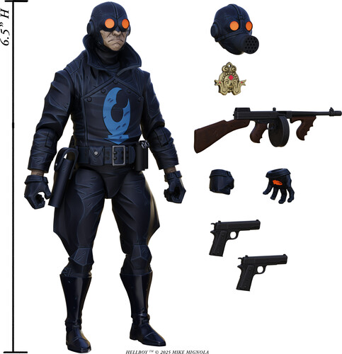 In the New York of 1937, the Lobster must stop both German Agents and a dangerous cult from gaining possession of a powerful invention. Lobster Johnson from “The Iron Prometheus” story has 24 points of articulation and includes alternate gas mask head, two pistols, holster, machine gun, Memnan Saa amulet and alternate hands. Figure is approx. 6.5” tall.