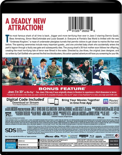 The most famous shark of all time is back... bigger and more terrifying than ever in Jaws 3 starring Dennis Quaid, Bess Armstrong, Simon MacCorkindale and Louis Gossett Jr. Everyone at Florida's Sea World is thrilled with the new "Undersea Kingdom," a maze of underwater plexiglass tunnels that permits visitors to get closer to marine life than ever before. The opening ceremonies include many important guests... and one uninvited baby shark who accidentally enters the park's lagoon through a faulty sea gate and subsequently dies. The young shark's 35-foot mother soon follows her offspring, creating the most horrifying tale of terror ever filmed in the water. Directed by Joe Alves, the original Jaws designer, and co-written by Carl Gottlieb who penned the first two blockbusters, this action-packed adventure will have you screaming for your life.