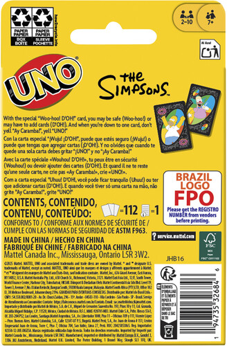 Featuring graphics inspired by favorite characters and scenes, players try to match colors and numbers as they race to get rid of their cards. A special "Woo-hoo! D'OH!" rule adds an exciting twist to the game. And when down to a last card, don't forget to yell "UNO!"