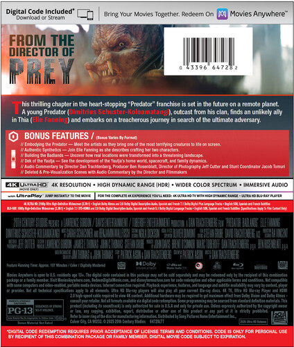 This thrilling chapter in the heart-stopping “Predator” franchise is set in the future on a remote planet. A young Predator (Dimitrius Schuster-Koloamatangi), outcast from his clan, finds an unlikely ally in Thia (Elle Fanning) and embarks on a treacherous journey in search of the ultimate adversary.