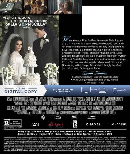 Cailee Spaeny, Jacob Elordi. Based on the true story and Priscilla Presley’s memoir "Elvis and Me," this biopic romance portrays the difficult, tumultuous and emotionally complex relationship between Elvis Presley and Priscilla, who was just 14 when she met and fell for the legendary singer. Directed by Sofia Coppola. Includes the complete film on Blu-ray, DVD and Digital formats on 2 Discs. 2023/color/113 min/R/widescreen.