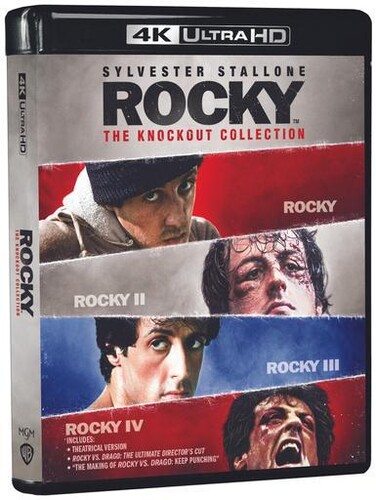 Rocky 4-Film I-IV Collection (Rocky/Rocky II/Rocky III/ Rocky IV) (4K UHD) Four-disc set includes: Rocky (1976)This rousing underdog tale from writer/star Sylvester Stallone and director John G. Avildsen struck a chord with audiences around the world and won three Academy Awards, including Best Picture. When flamboyant heavyweight champ Apollo Creed (Carl Weathers) announces a Bicentennial bout in Philadelphia, local pug boxer Rocky Balboa (Stallone) gets a dream shot at taking the title. With Talia Shire, Burt Young, and Burgess Meredith. 120 min. C/Rtg: PG Rocky II (1979)Retired from the ring and having trouble carving out a new career, Philly's own Rocky Balboa (Sylvester Stallone, who also wrote and directed) reluctantly accepts champ Apollo Creed's (Carl Weathers) challenge to another fight, setting the stage for the rematch of the century (and invalidating the theme of the first film). Talia Shire, Burt Young, and Burgess Meredith also star. 119 min. C/Rtg: PG Rocky III (1982)In the third knockout drama, heavyweight champ Rocky Balboa (Sylvester Stallone) suffers a devastating defeat at the hands of mohawked club boxer Clubber Lang (Mr. T). With some unlikely help from former foe Apollo Creed (Carl Weathers), Rocky prepares to step back into the ring and reclaim his title. With Talia Shire, Burt Young, Burgess Meredith, and Hulk Hogan as Thunderlips. Written and directed by Stallone. 99 min. C/Rtg: PG Rocky IV (1985)"Yo, Ivan!" Sylvester Stallone is back as heavyweight champ Rocky Balboa, this time squaring off against towering Soviet boxer Ivan Drago (Dolph Lundgren), an unstoppable fighting machine who has already killed one man in the ring. All this, and a plea for global understanding, too. With Talia Shire, Carl Weathers, Burt Young, Brigitte Nielsen, and James Brown as himself. Written and directed by Stallone. 91 min. C/Rtg: PG