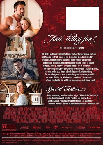 HOUSEMAID [DVD] Given her problematic past, Millie Calloway (Sydney Sweeney) felt lucky to be hired as live-in help for Long Island housewife Nina Winchester (Amanda Seyfried). As Millie settles into domestic routine with Nina's husband Andrew (Brandon Sklenar) and daughter Cecelia (Indiana Elle), she's exposed to Nina's propensity for violent psychotic breaks... and would learn that the truth behind them was more shocking still. Paul Feig's gripping take on the Freida McFadden novel. RUNTIME: 131 minutes.