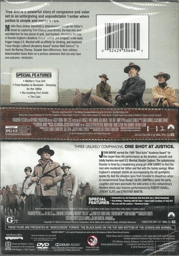TRUE GRIT (1969): In 1970, John Wayne won an Academy Award. For his larger-than-life performance as the drunken, uncouth and totally fearless one-eyed U.S. Marshall, Rooster Cogburn. The cantankerous Rooster is hired by a headstrong young girl (Kim Darby) to find the man who murdered her father and fled with the family savings. When Cogburn's employer insists on accompanying the old gunfighter, sparks fly. And the situation goes from troubled to disastrous when an inexperienced but enthusiastic Texas Ranger (Glen Campbell) joins the party. Laughter and tears punctuate the wild action in this extraordinary Western which features performances by Robert Duvall and Strother Martin. TRUE GRIT (2010): True Grit is a powerful story of vengeance and valor set in an unforgiving and unpredictable frontier where justice is simple and mercy is rare. Mattie Ross (Hailee Steinfeld), is determined to avenge her father's blood by capturing Tom Chaney (Josh Brolin), the man who shot and killed him for two pieces of gold. Just fourteen, she enlists the help of Rooster Cogburn (Academy Award Winner Jeff Bridges), a one-eyed, trigger-happy U.S. Marshall with an affinity for drinking and hardened Texas Ranger LaBoeuf (Academy Award Winner Matt Damon) to track the fleeing Chaney. Despite their differences, their ruthless determination leads them on a perilous adventure that can only have one outcome: retribution.